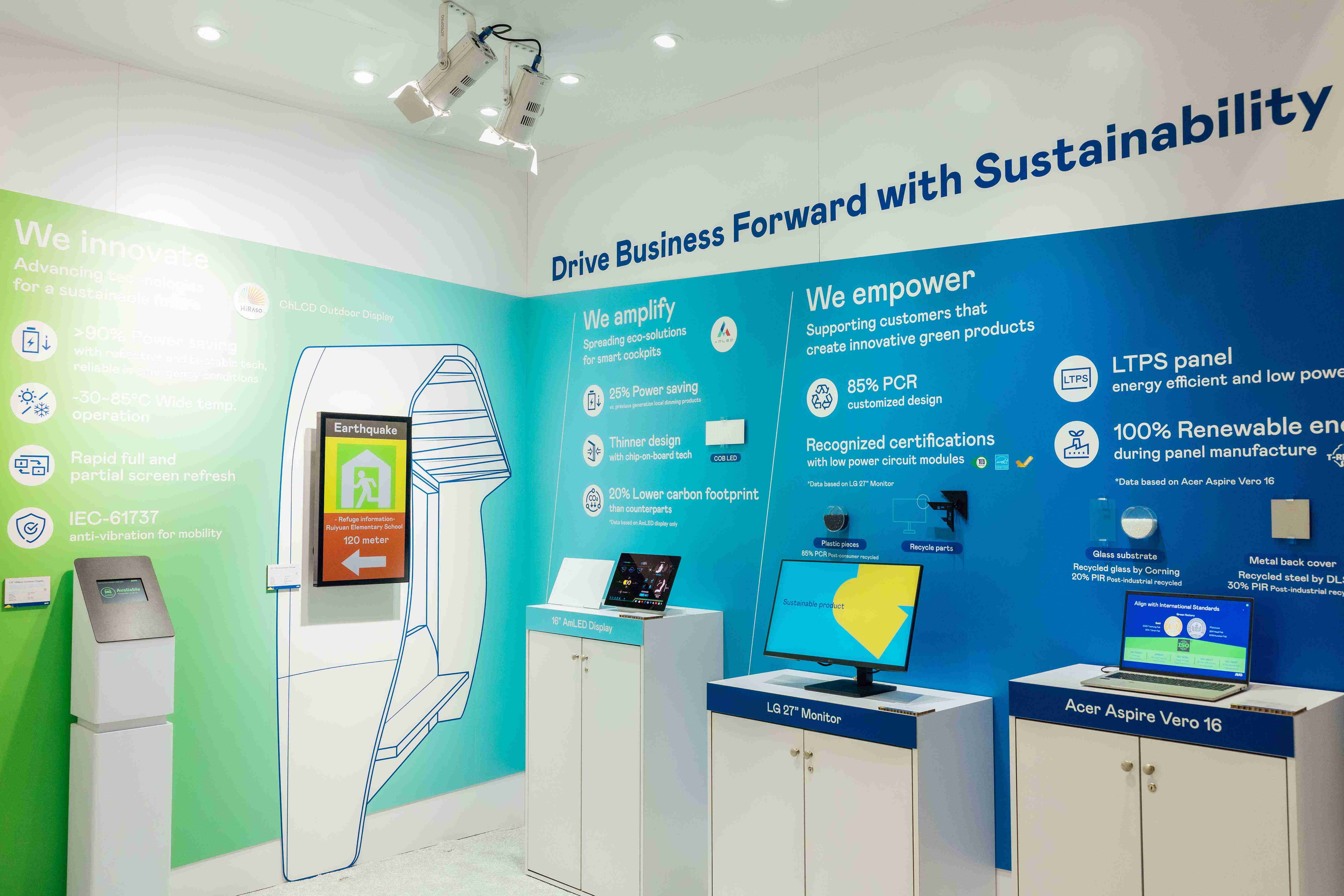 2121非凡运用创新显示技术HiRaso胆固醇液晶双稳态技术达到显示零耗能、、、、扩大节能省电的AmLED显示技术应用于车用产品、、以再生的消费后回收(PCR)塑料及全绿电生产之面板,,,应用于笔电及萤幕,,,,增加绿色价值。。。。