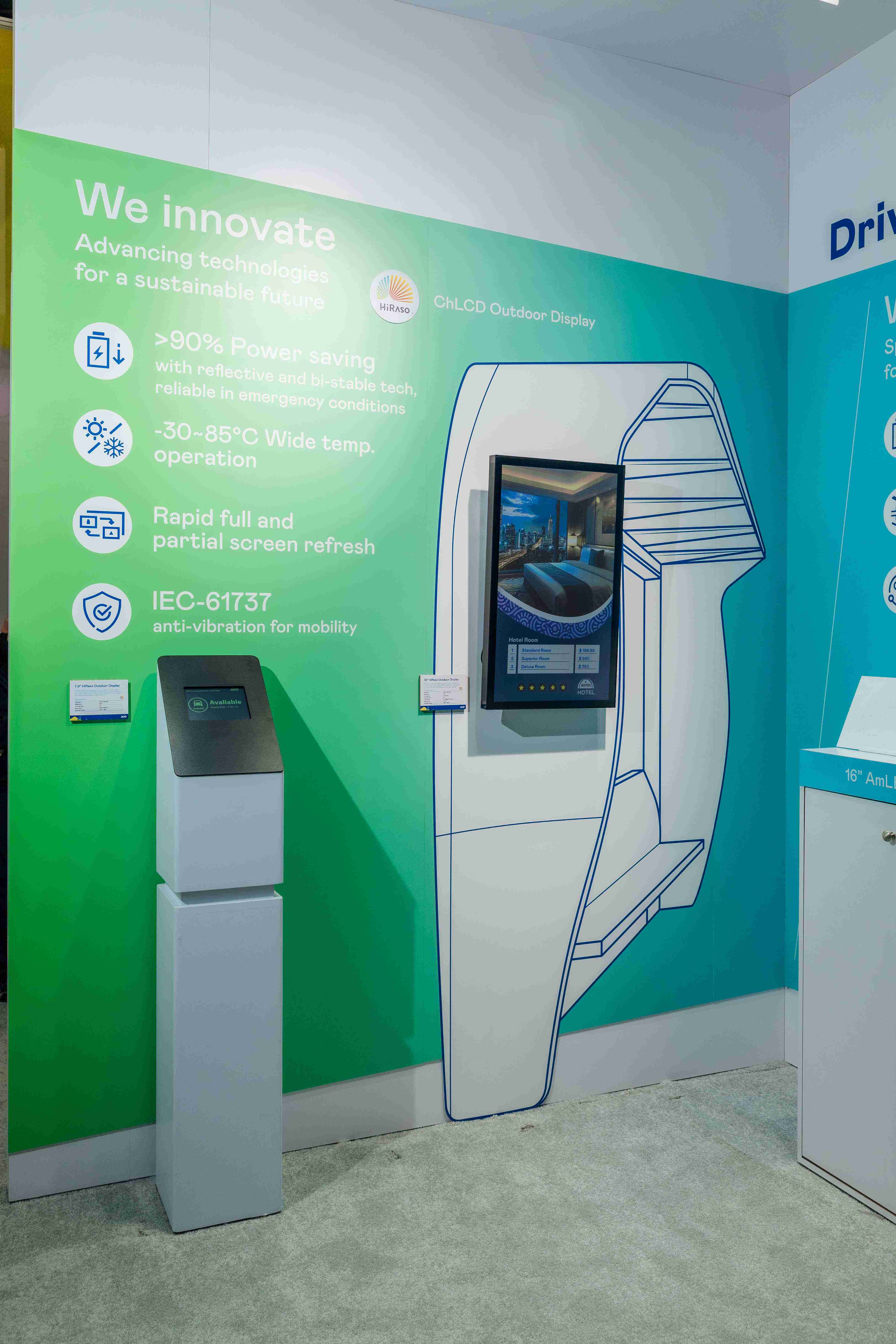HiRaso胆固醇液晶显示器运用反射环境光线的方式,,呈现影像显示时零耗能的环保省电诉求,,,,光线愈强愈能呈现绝佳的色彩饱和度及显示效果,,,同时在摄氏-30度至85度间宽温的使用优势,,,,为户外电子看板的新首选。。