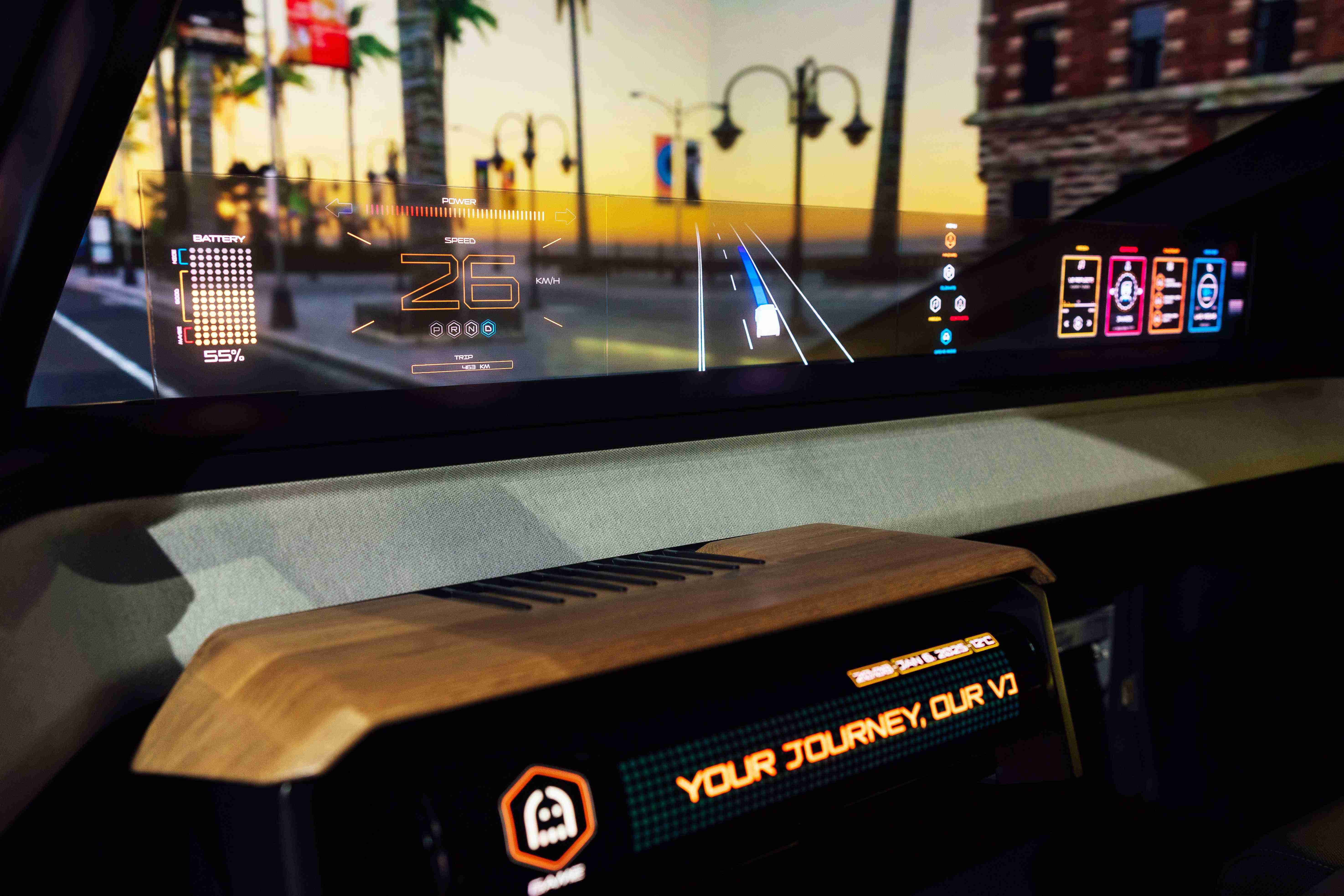 车用运算方案驱动无界透明显示介面(Horizon Image Glass),,,整合仪表板、、中控及副驾显示功能为一体式全景呈现,,不仅提供清晰的外部视野,,,,亦能即时显示车辆状态、、导航及路况资讯,,并赋予个性化设定与驾驶安全警示等加值化服务。。